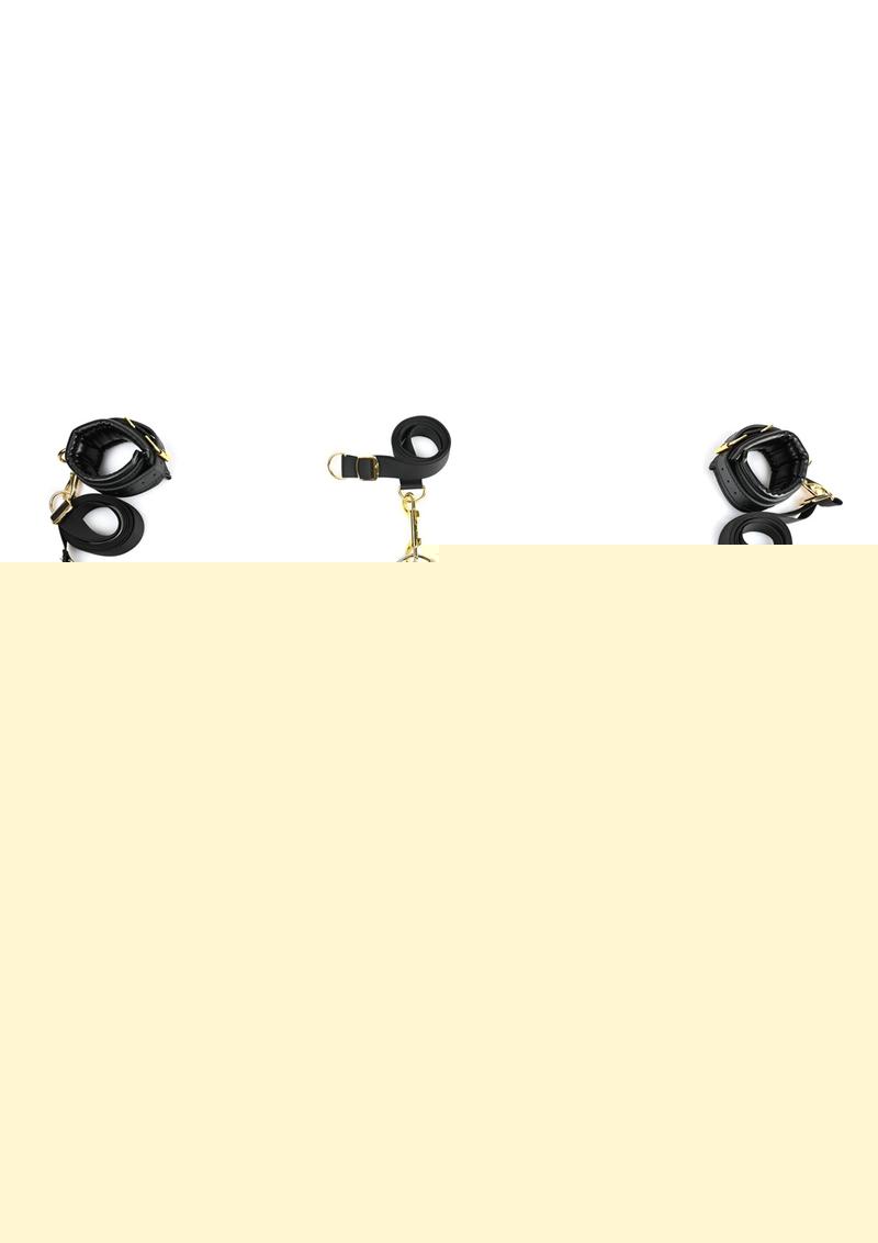 A strong nylon anchor connector strap slides under your mattress to secure six adjustable restraint straps. Four straps end in high-quality faux leather wrist and ankle cuffs with golden hardware while two are crafted with loops that promise leverage of all kinds. Position the straps around your mattress just the way you like them, tie your lover down tight, and slip the soft velvet blindfold over their eyes for a session full of surprises.